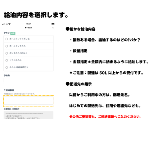 数量指定やポリ缶の置場所等